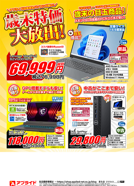 アプライド全店 売り出し期間 12/27(土)~12/31(水)